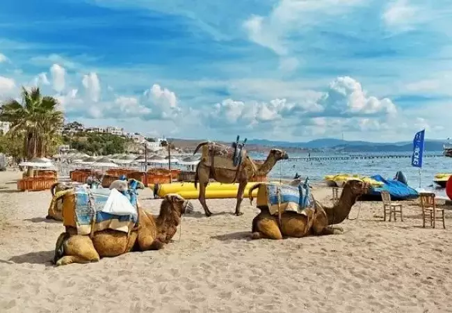 ساحل شتر یکی از مناطق دیدنی بدروم ترکیه، محسوب می شود. این ساحل با شنهای سفید و آب شفاف، بهترین مکان برای گشت و گذار و عکاسی در بدروم است. در این ساحل توریستی، میتوانید شترها را تماشا کنید یا حتی شترسواری کنید. چند رستوران نیز در این منطقه وجود دارد که برای صرف غذا میتوانید به آنها مراجعه کنید. به جز ساحل شتر، ساحل یاهسی، بیتز، تونا، هوراما، گوموسلوک، آکیارلار، کرجی، کیسه بوکو و کومباغچه از معروفترین سواحل و جزو جاهای دیدنی بدروم ترکیه هستند .