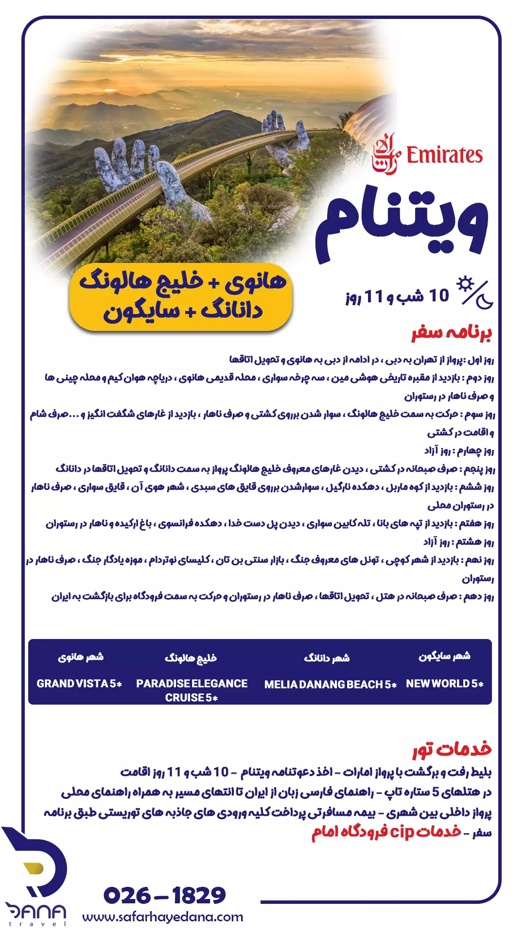تور ویتنام نوروز 1405یکی از پیشنهادهای ویژۀ سفرهای دانا به شما خواهد بود که با قیمت استثنایی این تور سفر شما جذابتر و دل نشین تر میشود. آژانس گردشگری و هواپیمایی سفرهای دانا با برگزاری تور ویتنام ، 11 روز خاطرهانگیز را در سفر برای شما میسازد. برای اطلاعات بیشتر و مشاهدۀ آفرهای تور ویتنام به صفحه تور ویتنام سفرهای دانا مراجعه کنید یا با کارشناسان تور ویتنام تماس بگیرید.